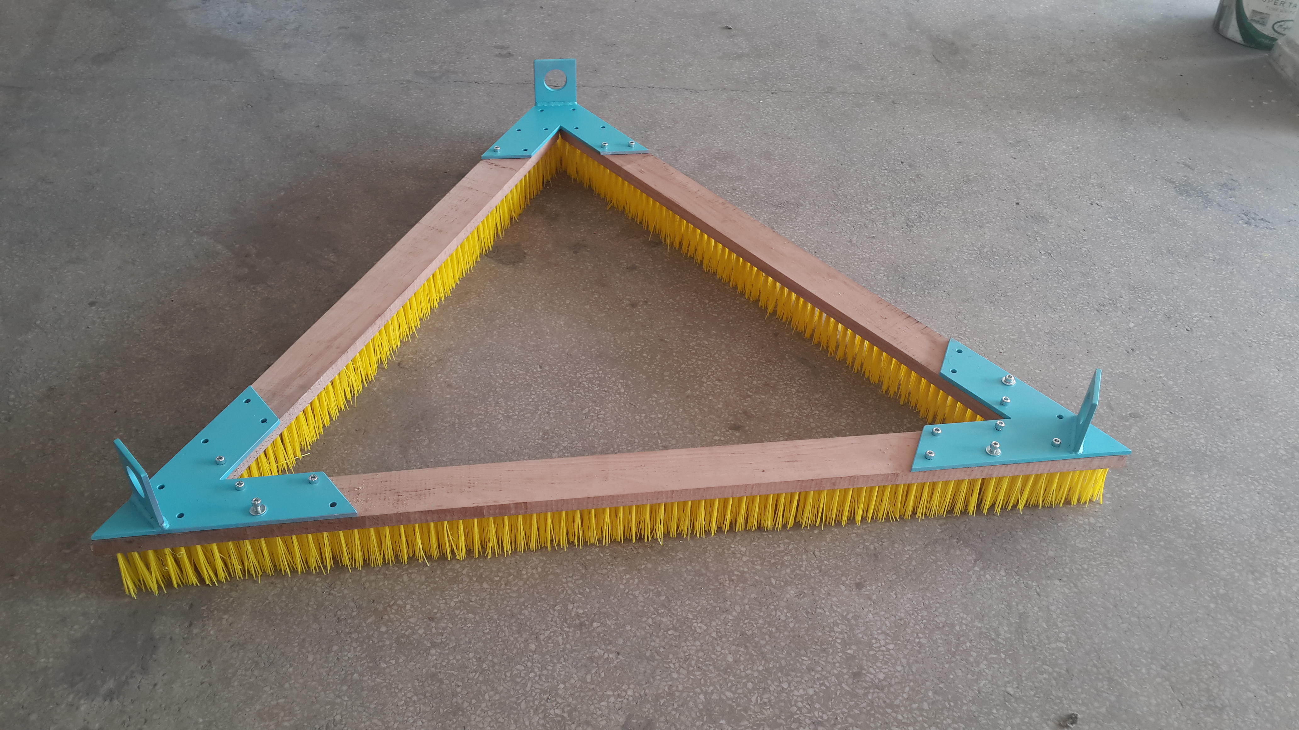 Üçgen fırçamızın 1 kenarının uzunluğu 1500mm’dir ağırlığı ise 15 kg’dir. Ürün demonte şekilde kargoya teslim edilir bu halinin ölçüleri 1500x100x320mm’dir. Fırçalar 3mm çapa ve 80mm uzunluğa sahiptir ayrıca esnemelere karşı dayanıklı olan 25mm kalınlığında 100mm genişliğinde fırınlanmış kayın ağacına çakılmıştır. Bağlantı parçaları ise 4mm DKP sacdan imal edilmiştir.